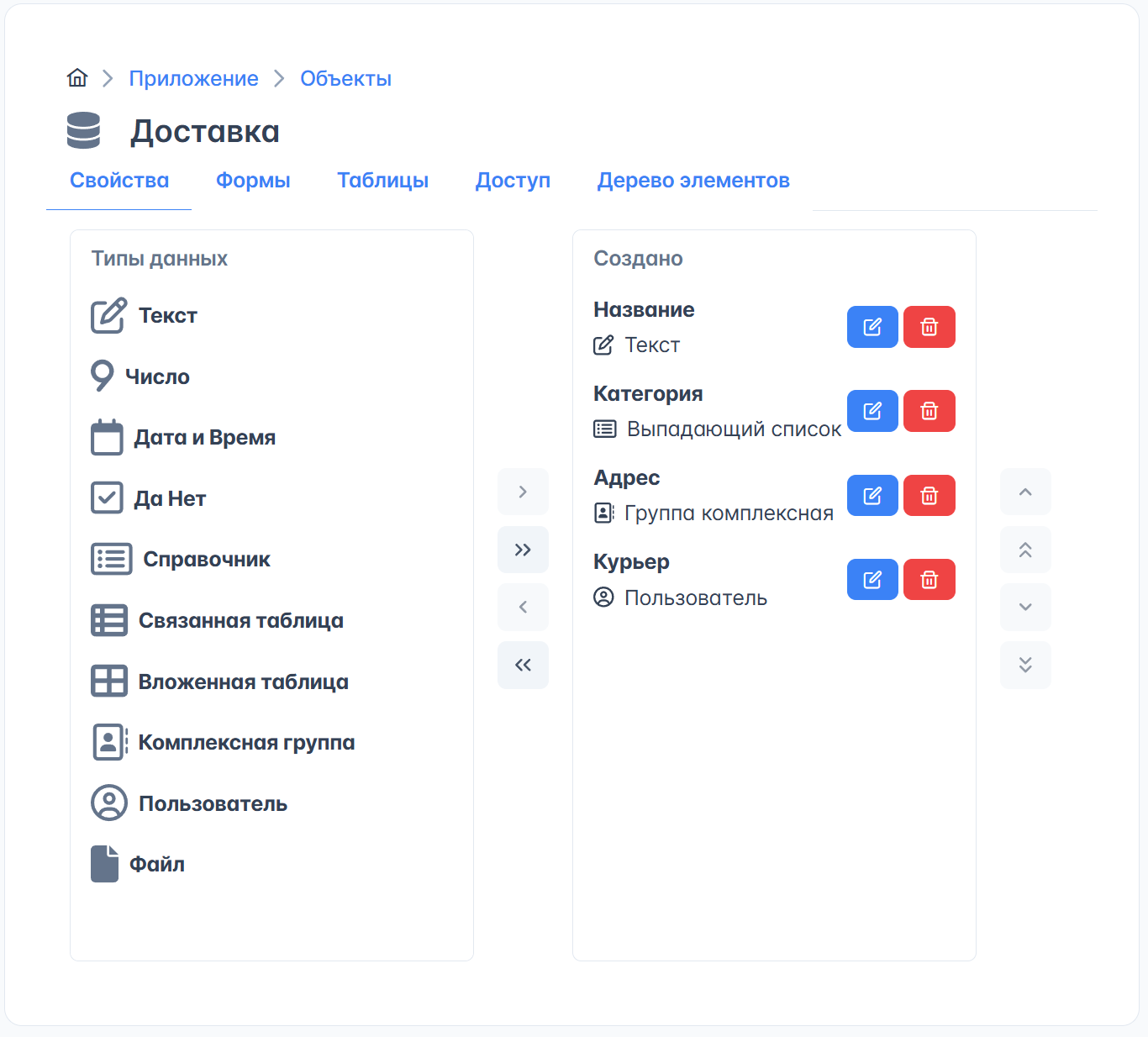 п.7,п.9.Создаем поля объекта, перетаскиваем нужные типы в правую колонку