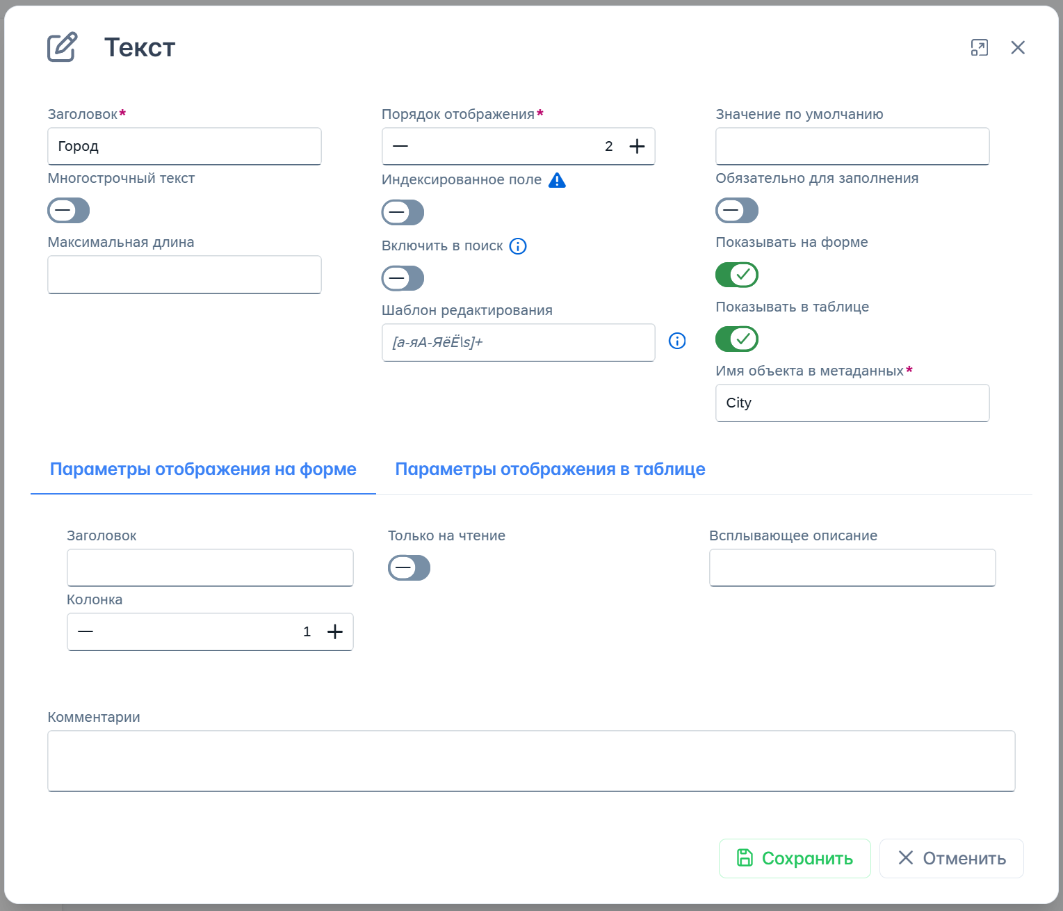 п.7,п.9..Форма при создании поля объекта, пример Текстового поля